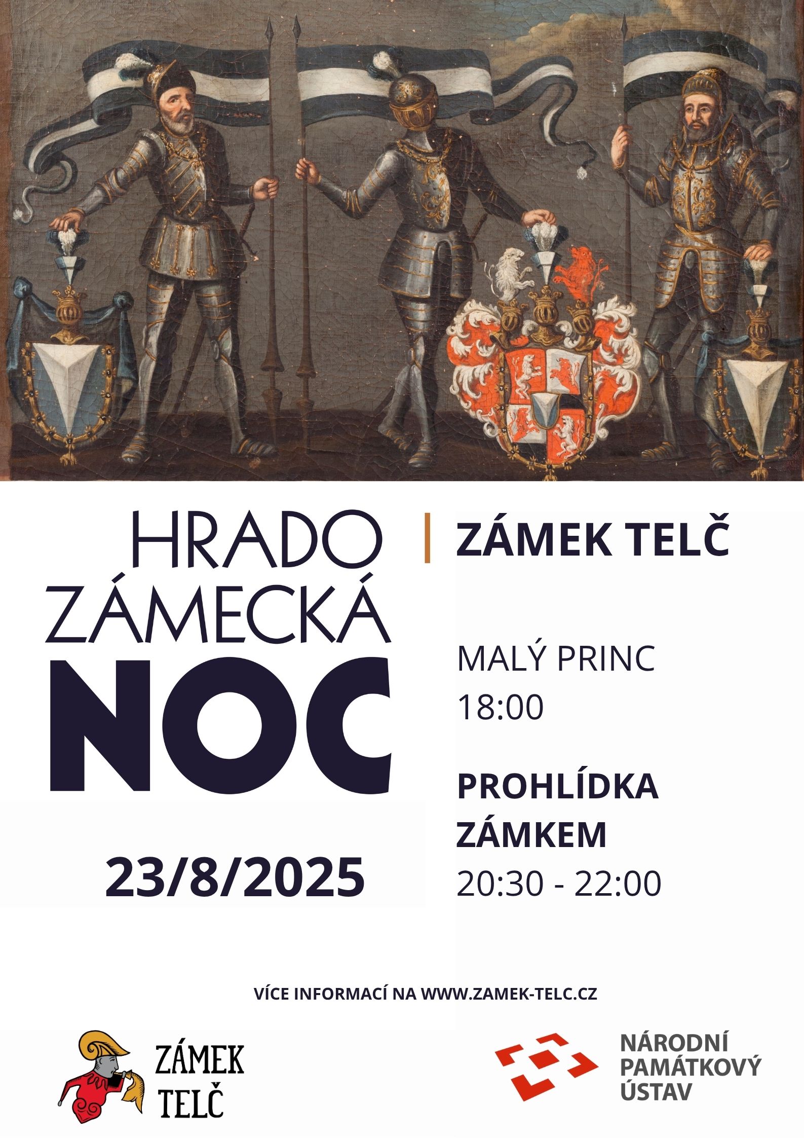 Od 20:30 se otevře vstup do zámku. Reprezentační sály budou přístupné bez průvodce. Ve Zlatém sále bude připravena malá výstava připomínající působení hraběcí rodiny Lichtenstein-Castelkorn na zámku v Telči. K dispozici bude informační leták, který bude stručnou formou informovat o nejdůležitějších osobnostech rodu a dochovaných předmětech.