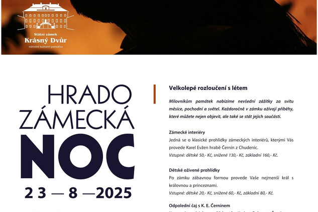 Letos se opět státní zámek Krásný Dvůr zapojí do Hradozámecké noci, oblíbeného projektu Národního památkového ústavu. A to netradičními večerními a nočními hranými prohlídkami v zámeckých interiérech napříč staletími historií zámku.