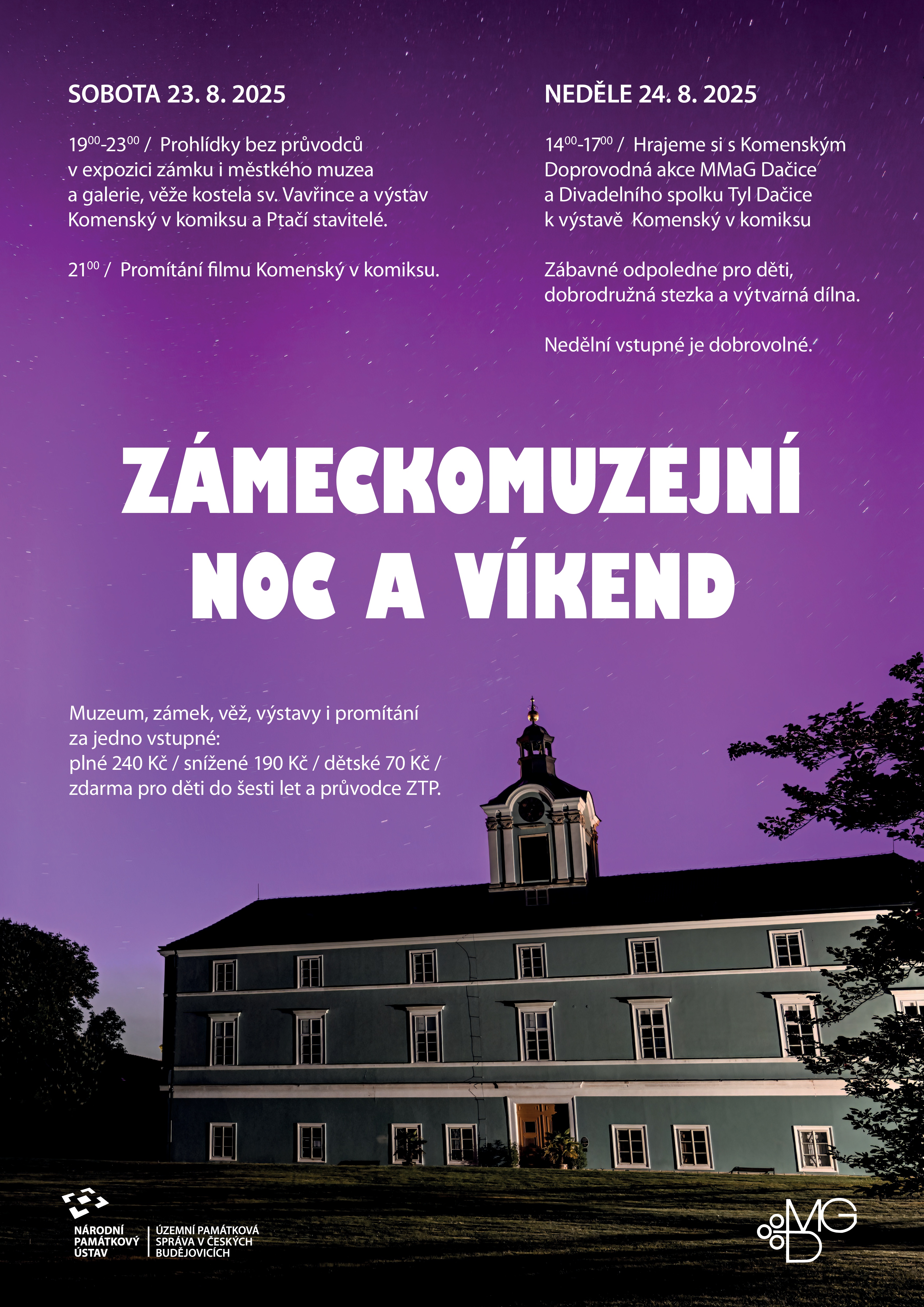Ve 21:00 bude na nádvoří promítán film Komenský v komiksu, který koresponduje s výstavou, která je v prostorách MMaG Dačice k vidění a prožití do 24. 8. 2025.